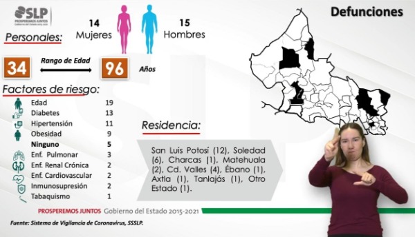 De las nuevas 29 defunciones, se dio a conocer que las víctimas corresponden a 14 mujeres y 15 hombres, con un rango de edad de 34 a 96 años, con residencia en los municipios de la capital (12); Soledad (6); Charcas (1); Matehuala (2); Ciudad Valles (4); Ébano (1); Axtla (1); Tanlajás (1); otro estado (1); mismas que presentaban como antecedentes factores de riesgo de edad (19); diabetes (13); hipertensión (11); obesidad (9); ninguno (5); enfermedad pulmonar (3); enfermedad renal crónica (2); enfermedad cardiovascular (2); inmunosupresión (2); y tabaquismo (1).
