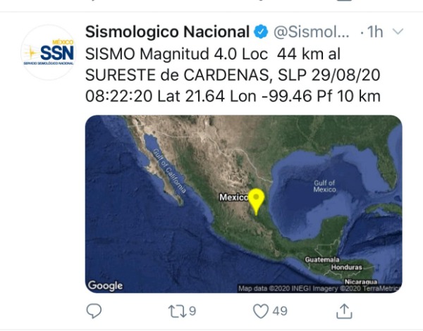 El servicio Sismológico Nacional reportó lo siguiente: SISMO Magnitud 4.0 Loc 44 km al SURESTE de CARDENAS, SLP 29/08/20 08:22:20 Lat 21.64 Lon -99.46 Pf 10 km.