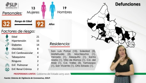 De las nuevas 32 defunciones, se dio a conocer que las víctimas corresponden a 13 mujeres y 19 hombres, con un rango de edad de 32 a 92 años, con residencia en los municipios de la capital (15); Soledad (3); Matehuala (2); Moctezuma (1); Venado (1); Mexquitic (1); Santa María (1); Villa de Ramos (1); Ciudad del Maíz (1); Ciudad Valles (3); Tamasopo (1); San Vicente (1); otro estado (1); mismas que presentaban como antecedentes factores de riesgo de edad (21); hipertensión (15); diabetes (14); obesidad (8); enfermedad cardiovascular (4); tabaquismo (4); ninguno (2); enfermedad pulmonar (2); enfermedad renal crónica (2).