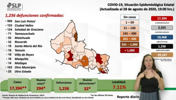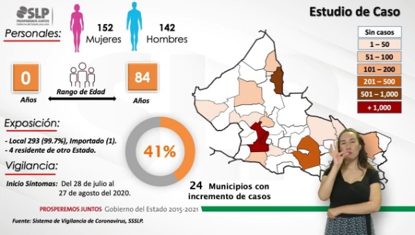 Sobre los nuevos 294 casos positivos a coronavirus, se detalló que se trata de 152 mujeres y 142 hombres, en un rango de edad de 0 a 84 años; mismos que tienen como residencia 193 en la capital; 40 en Soledad; 15 en Matehuala; dos en los municipios de Charcas y Villa de la Paz; uno en los municipios de Cedral, Moctezuma, Villa de Arista, Villa de Ramos, Villa de Reyes, Zaragoza y Rioverde; dos en Ciudad del Maíz; siete en Ciudad valles; dos en Tamuín; uno en los municipios de Tamuín y El Naranjo; seis en Tamazunchale; cuatro en Matlapa; tres en Xilitla; dos en Axtla; uno en Tampacán, Tancanhuitz y San Antonio; y cuatro de otros estados.
