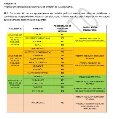 De acuerdo al porcentaje de la población indígena la primera regiduría de mayoría relativa y plurinominal de los municipios de Tamuín, San Vicente Tancuayalab, Alaquines y Xilitla (quienes tienen del 50 al 69.9 por ciento de población indígena); Tamazunchale, San Martín Chalchicuautla, Tampacán, Santa Catarina, Axtla de Terrazas, Huehuetlán, Aquismón, y Tampamolón Corona (que tienen un porcentaje de población indígena del 70 al 89.9 por ciento; Matlapa, Tancanhuitz, Coxcatlán, Tanlajás y San Antonio (con más del 90 por ciento de población indígena), tendrían un cabildo 100 por ciento indígena.