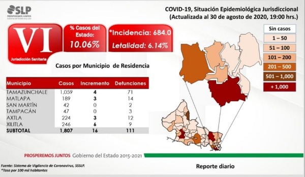 La estadística dada a conocer está distribuida en Tamazunchale con, Matlapa, San Martín, Tampacán, Axtla y Xilitla. En los últimos 14 días los casos nuevos se han incrementado en un 158%.