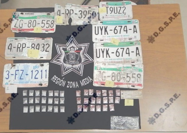 Como resultado de la inspección, se aseguraron 41 dosis de la droga sintética conocida como cristal en el interior del vehículo y ocho matrículas de los estados de Guanajuato, Zacatecas y San Luis Potosí, solicitando el estatus de las mismas al Centro de Control, Comando, Comunicaciones y Cómputo (C-4) arrojando que todas ellas pertenecían a vehículos con reportes de robo.