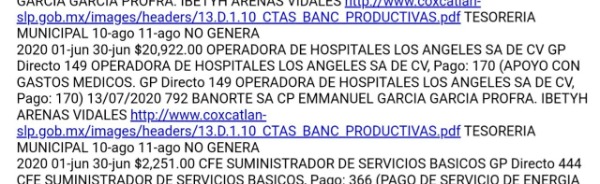 Si bien, hay gastos fundamentales para el desarrollo de diversas actividades, como el pago de la nómina, gasolina para la recolección de basura, además de combustible para traslados de pacientes en vehículos del Sistema DIF Municipal, hay otros que resultan inverosímiles, tales, como la recuperación de gastos a la propia alcaldesa, por el atención médica en un hospital privado en Ciudad Valles, cuyo monto total egresado en este mes de agosto asciende a los 926 mil 280.97 pesos.