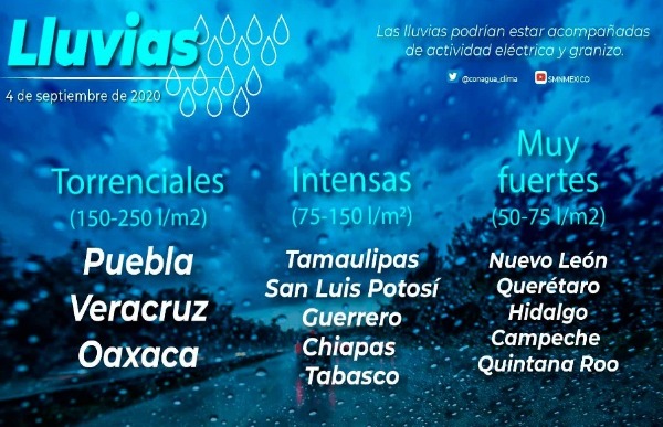 Explicó que de acuerdo a información del Servicio Meteorológico Nacional (SMN) los remanentes de la tormenta "Nana" y un canal de baja presión sobre el noreste del territorio nacional, en interacción con el ingreso de aire cálido y húmedo proveniente del Golfo de México con inestabilidad superior, originará este viernes lluvias puntuales intensas (de 75 a 150 milímetros) en el noreste del país, incluyendo San Luis Potosí.