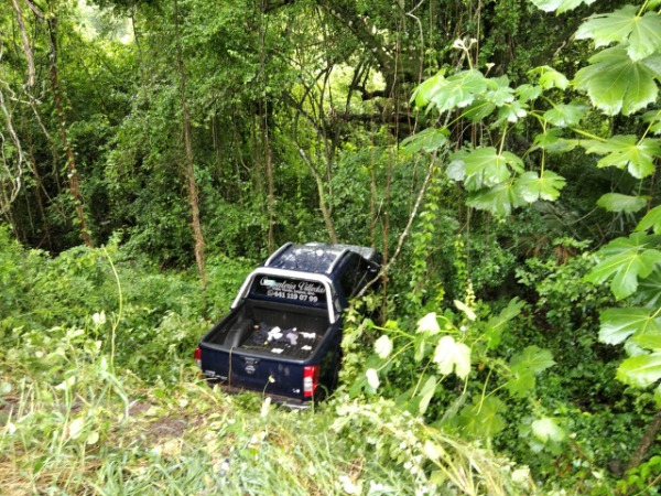 Una camioneta marca Nissan Frontier color azul, con placas de circulación del Estado de Querétaro, se salió del camino y cayó a un desnivel.
