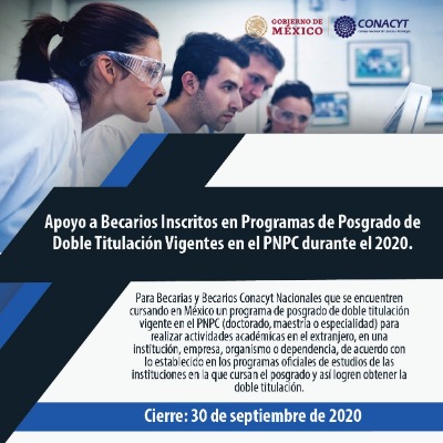 El Consejo Potosino de Ciencia y Tecnología (COPOCYT), invita a las instituciones de educación superior y centros de investigación públicos en el estado, para participar en la convocatoria del Consejo Nacional de Ciencia y Tecnología (CONACYT), para postular Becarios inscritos en programas de posgrado de doble titulación vigentes en el Programa Nacional de Posgrados de Calidad (PNPC) a nivel de doctorado, maestría o especialidad, para recibir un apoyo para realizar actividades académicas en el extranjero en una institución, empresa, organismo o dependencia.