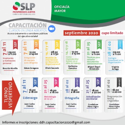 Con el propósito de identificar las funciones, tareas, destrezas, habilidades y actitudes que los servidores públicos de las distintas dependencias y entidades gubernamentales que deben de desarrollar para atender con calidad a la ciudadanía potosina, la Dirección Administrativa de Oficialía Mayor del Estado, ofrece una variedad de cursos en línea, para el mes de septiembre como son "Modelos de Intervención en Desarrollo Organizacional", "Cómo implementar Kaizen en el Sitio de Trabajo", entre otros, informó la Oficial Mayor Ada Amelia Andrade Contreras.