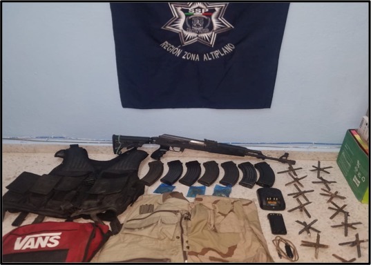 Como resultado de los operativos de seguridad llevados a cabo por Policías Estatales y elementos de la Sedena, en la zona Altiplano, fue asegurado un automotor con diversos objetos, entre ellos un arma de fuego, más de 100 cartuchos útiles y equipo táctico.