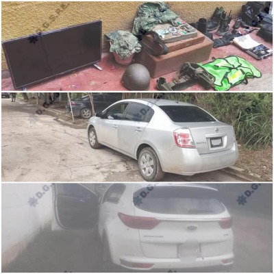 Entre los objetos confiscados y puestos a disposición de la Fiscalía General del Estado (FGE), se encuentran, un automóvil Kia Sport Age, color blanco, y un Nissan Sedan, color gris, donde fueron localizados diverso equipo táctico, uniformes, fornituras además de radios trasmisores.