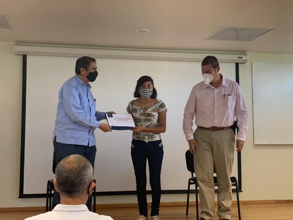 El doctor Alejandro Zermeño Guerra entregó un reconocimiento al maestro Marco Antonio Pérez Orta, quien fuera coordinador y fundador de la Unidad Académica Región Huasteca Sur en 2012.