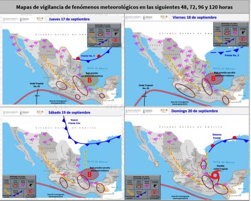 Finalmente, durante el periodo de pronóstico, un posible ciclón tropical se desplazará hacia el norte, recorriendo lentamente el occidente del Golfo de México (frente a las costas de Tamaulipas y Veracruz) y en interacción con un canal de baja presión afectarán al noreste, centro, oriente y sureste del territorio nacional.