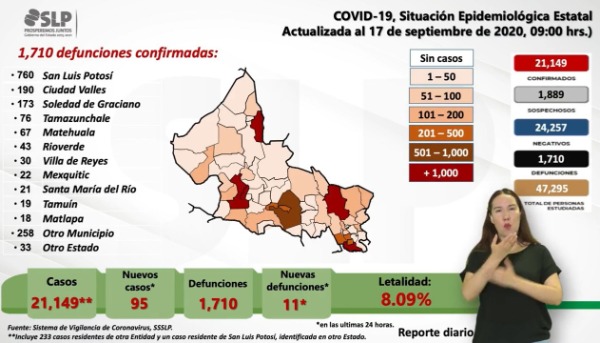Sobre los nuevos 95 casos positivos a coronavirus, se detalló que se trata de 38 mujeres y 57 hombres, en un rango de edad de 5 a 74 años; mismos que tienen como residencia 61 en la capital; nueve en Soledad; tres en Matehuala; dos en los municipios de Mexquitic, Salinas y Villa de Reyes; uno en los municipios de Ahualulco y Villa Hidalgo; seis en Ciudad Valles; uno en Tamuín; dos en Tamazunchale y Xilitla; uno en Matlapa; uno en Coxcatlán y Huehuetlán.
