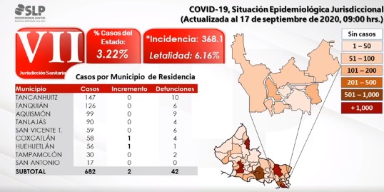Dos nuevos casos de coronavirus se registró la Jurisdicción Sanitaria número VII, con sede en Tancanhuitz en las últimas 24 horas, dando un total de 682, informó el jefe de la dependencia, Jonás Terán Secundino.