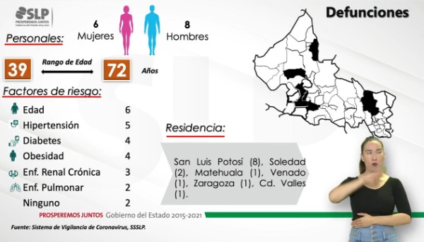Los 141 nuevos casos están en el rango de 4 a 91 años de edad y se consideran 136 casos de transmisión local y 5 foráneos. Los 14 lamentables decesos son 8 hombres y 6 mujeres, con residencia en la capital (8), Soledad (2), Matehuala, Zaragoza, Ciudad Valles y Venado. Los decesos tenían factores concomitantes de riesgo como edad (8), hipertensión (4) diabetes (5), obesidad (2).