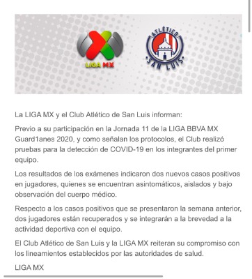 La LIGA MX y el Club Atlético de San Luis confirmaron que dos jugadores más del Atlético de San Luis resultaron positivos a Covid-19, sumando así ya siete jugadores del primer equipo.