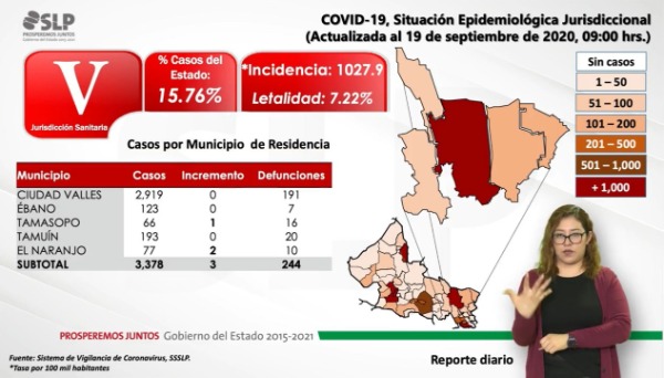 Ciudad Valles presenta al corte de este día un incremento de cero contagios, mientras que el total de pacientes es de 2 mil 919 y 191 víctimas mortales.