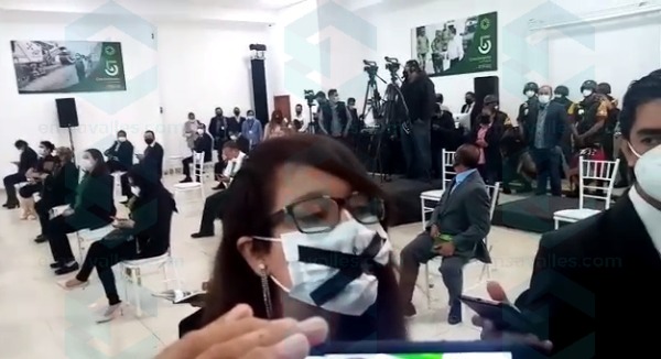 Grecia Selene Pérez González, regidora por Morena en Soledad de Graciano Sánchez se colocó una especie de tache negra sobre el cubrebocas a manera de protesta, previo al segundo informe de gobierno de la actual administración.