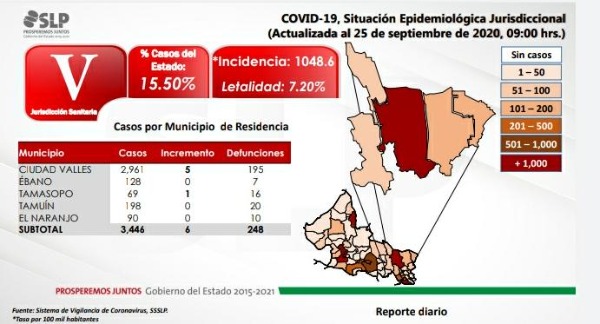 Ciudad Valles presenta al corte de este día un incremento de cinco contagios para un total de 2 mil 961 pacientes y 195 víctimas mortales, una de ellas falleció en las últimas horas.