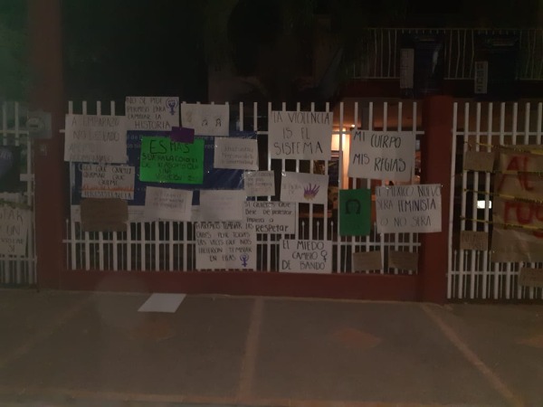 El colectivo feminista Aquelarre no solicitó ningún permiso para colocar las mantas y cartulinas que ocuparon como parte de la protesta que realizaron la tarde de ayer, dijo Pedro Hugo Sánchez López, Director de Espectáculos.