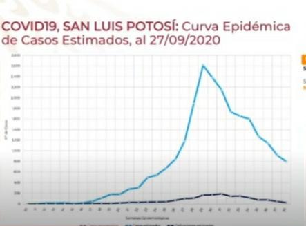 SLP llegó a un punto máximo en casos de COVID 19, en la semana 31, del 27 de julio al 2 de agosto, de ahí tuvo un punto de reducción muy claramente marcado y tiene varias semanas en descenso, confirmándose que sigue en color naranja, esperando que próximamente pase a color amarillo.