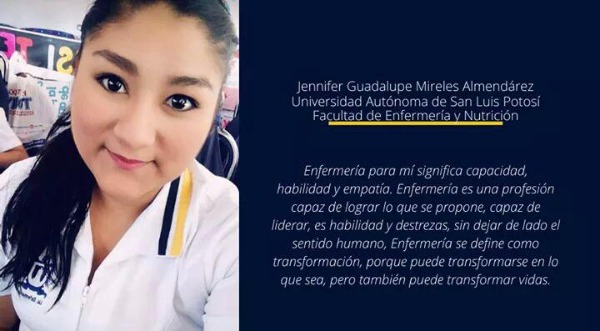 Explicó que la convocatoria "Enfermeras y Enfermeros Jóvenes Destacados", en San Luis Potosí fue abierta tanto para estudiantes o egresados de licenciatura o alguna carrera técnica. Los interesados debían enviar un mensaje junto con su fotografía donde responderán algunas preguntas, principalmente para conocer su sentir y cómo se visualizaban como personal de enfermería.