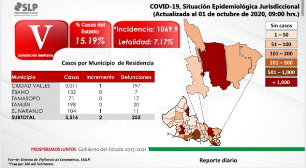 Ciudad Valles presenta al corte de este día un incremento de un contagio para un total de 3 mil 11 pacientes y 197 víctimas mortales, una de ellas falleció en las últimas horas.