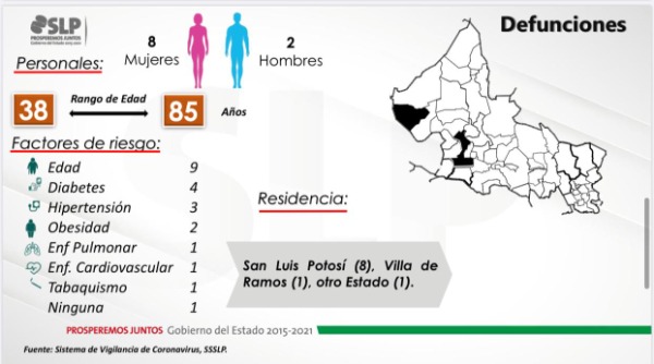 De las nuevas 10 defunciones, se dio a conocer que las víctimas corresponden a 8 mujeres y 2 hombres, con un rango de edad de 38 a 85 años, con residencia en los municipios de la capital ; mismas que presentaban como antecedentes factores de riesgo de .