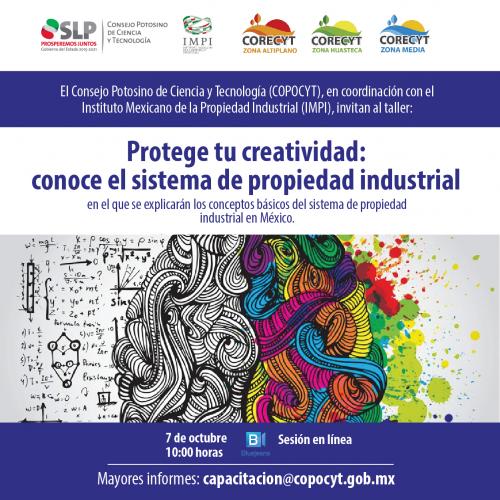 El Consejo Potosino de Ciencia y Tecnología (COPOCYT), invita a participar en el taller "Protege tu creatividad: Conoce el sistema de propiedad industrial" que se realizará el 7 y 8 de octubre de 2020 a las 10:00 horas y, que será impartido por el Instituto Mexicano de la Propiedad Industrial (IMPI), informó la directora general de la dependencia Rosalba Medina Rivera.