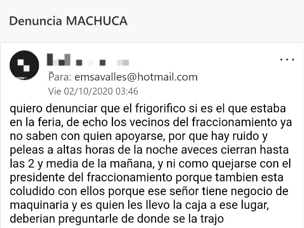 "Quiero denunciar que el frigorífico si es el que estaba en la feria, de echo los vecinos del fraccionamiento ya no saben con quien apoyarse, por que hay ruido y peleas a altas horas de la noche aveces cierran hasta las 2 y media de la mañana, y ni como quejarse con el presidente del fraccionamiento porque tambien esta coludido con ellos porque ese señor tiene negocio de maquinaria y es quien les llevo la caja a ese lugar, deberían preguntarle de donde se la trajo", señalaron de manera anónima los afectados.