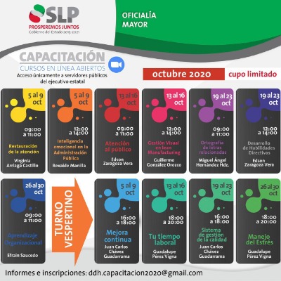Con fecha del 19 al 23 de octubre, el maestro Miguel Ángel Hernández Hernández, presentará el curso "Ortografía de Letras Relacionadas", en un horario de 09:00 a 11:00 horas. Posteriormente de 12:00 a 14:00 horas, será impartido el curso "Desarrollo de Habilidades Directivas", por el maestro Edson Enrique Zaragoza Vera. Del 26 al 30 de octubre se llevará a cabo el curso "Aprendizaje Organizacional", que aplicará el maestro Efraín Saucedo, el cual se realizará de 09:00 a 11:00 horas.