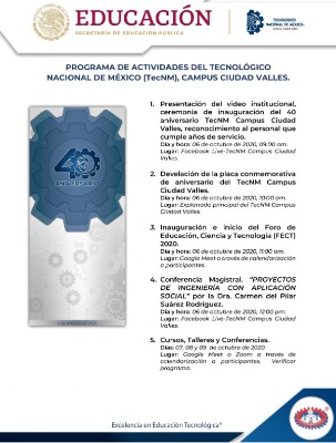 Ese mismo día a las 10 de la mañana, en la explanada principal del Tec en Ciudad Valles, se develará la placa conmemorativa de aniversario; y a las 11 de la mañana, a través de Google Met, será la inauguración e inicio del Foro de Educación, Ciencia y Tecnología 2020.