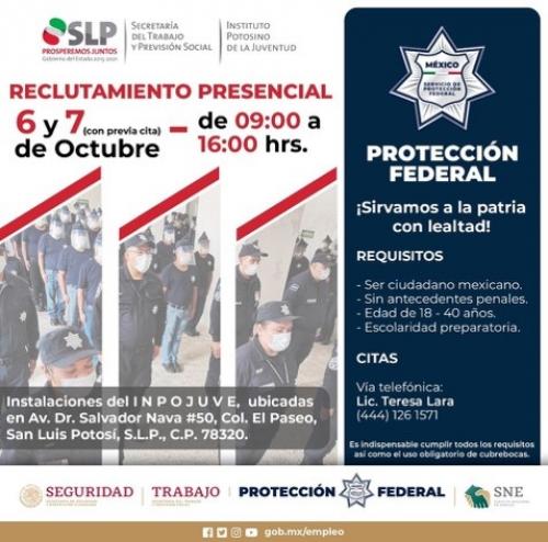 La Secretaría del Trabajo y Previsión Social (STPS), a través del Servicio Nacional de Empleo (SNE) y, en coordinación con el Servicio de Protección Federal, convoca a la Jornada de Reclutamiento que se realiza de manera presencial este 6 y 7 de octubre, en las instalaciones del Instituto Potosino de la Juventud (INPOJUVE) de 9:00 a 16:00 horas, informó Manuel Lozano Nieto, titular de la dependencia.