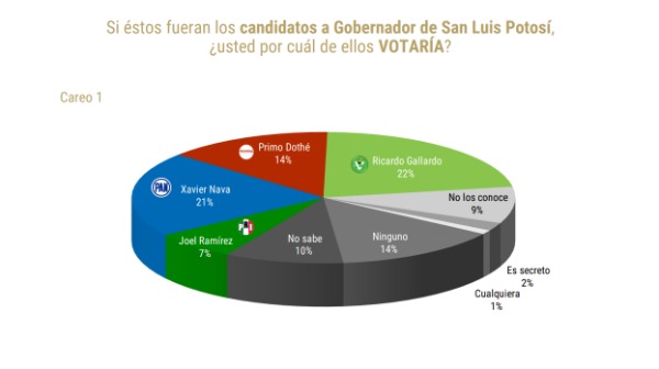 En un segundo careo, nuevamente ganaría Gallardo Cardona, en las mismas circunstancias, con el 21 por ciento, pero con mayor diferencia, si el candidato del PAN fuera Pedroza Gaitán, quien obtendría 19 por ciento de la votación, mientras que Dothé Mata por Morena subiría un punto porcentual.