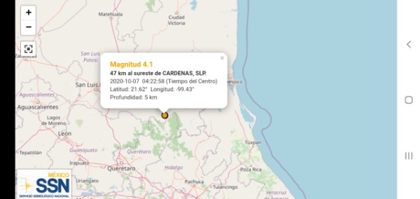 De acuerdo al Servicio Sismológico Nacional (SSN), este movimiento telúrico se registró a las 4:22 horas y tuvo como epicentro las coordenadas 21.62º-99.43º, a unos 5 kilómetros de Santa Catarina, a una profundidad de 5 kilómetros con una intensidad de 4.1.