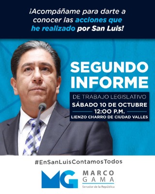 El Senador por San Luis Potosí, Marco A. Gama Basarte informó que este próximo sábado presentará en Ciudad Valles, S.L.P. su segundo informe de trabajo, evento en el que lo acompañará el jefe nacional del PAN, Marko Cortés Mendoza y el líder estatal del partido, Juan Francisco Aguilar.