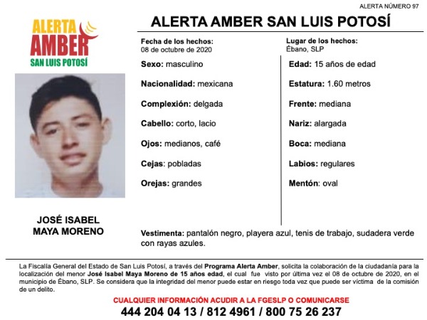 La Fiscalía General del Estado de San Luis Potosí (FGESLP), activó una Alerta Amber para localizar a un menor de 15 años de edad, de nombre José Isabel Maya Moreno, quien fue visto por última vez en la colonia Las Américas perteneciente al municipio de Ébano.