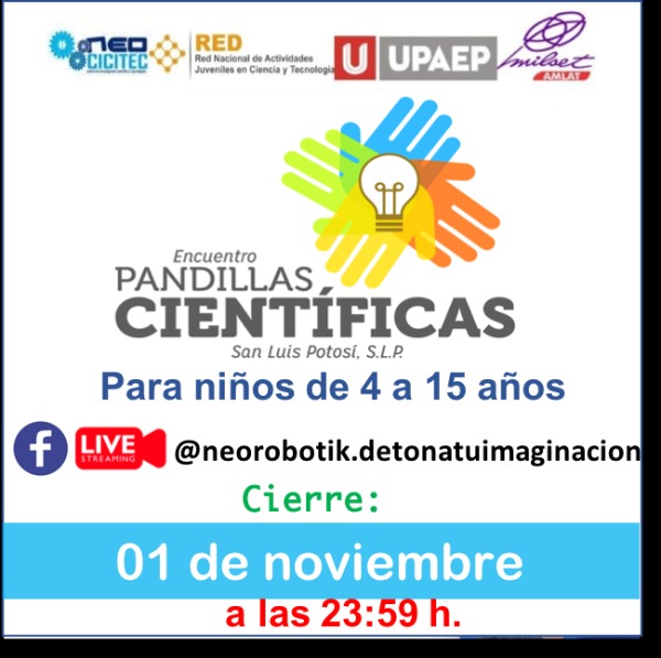 El Séptimo Encuentro de Pandillas Científicas San Luis Potosí 2020, cerrará su convocatoria el 01 de noviembre del 2020. Para mayor información, consultar las bases en el siguiente enlace: https://www.expociencias.net/docs_2020/CEPCSAN_LUIS_POTOSI_2020.pdfEl COPOCYT reitera la importancia de continuar con las acciones de higiene para evitar contagios por COVID-19 e invita a la población a tomar medidas preventivas como lavarse las manos constantemente, en especial, después de tocar superficies en lugares públicos; no saludar de mano o beso; limpiar superficies con agua y cloro; evitar tocarse el rostro con las manos sucias, así como estornudar o toser en la parte interna del codo.