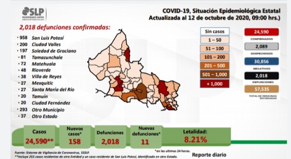 De las nuevas 11 defunciones, se dio a conocer que las víctimas corresponden a cinco mujeres y seis hombres, con un rango de edad de 53 a 91 años, con residencia en los municipios de la capital (8); Soledad (2); Cedral (1); mismas que presentaban como antecedentes factores de riesgo de edad (7); hipertensión (7); diabetes (6); ninguna (2); tabaquismo (2); enfermedad renal crónica (1); obesidad (1).