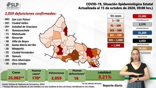 Sobre los nuevos 170 casos positivos a coronavirus, se detalló que se trata de 90 mujeres y 80 hombres, en un rango de edad de 7 a 82 años; mismos que tienen como residencia 113 en la capital; 15 en Soledad; ocho en Matehuala; dos en Cedral; uno en Charcas; uno en Santo Domingo; uno en Villa de Guadalupe; uno en Villa de la Paz; dos en Santa María del Río; uno en Cerro de San Pedro; dos en Salinas; uno en Villa de Ramos; dos en Ciudad Fernández; tres en Rioverde; siete en Ciudad Valles; cuatro en El Naranjo; tres en Tamazunchale; uno en Matlapa; uno en Xilitla; y uno de otro Estado.