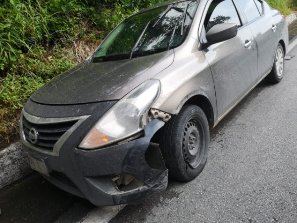 Pero lo hizo cerca de una curva, y antes de reincorporarse a su carril, chocó con su remolque, la parte frontal izquierda de un vehículo marca Nissan color gris, en el que viajaba una familia completa. Afortunadamente nadie salió herido.