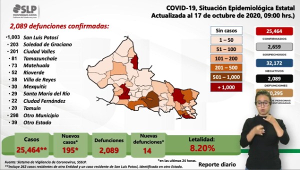 Sobre los nuevos 195 casos positivos a coronavirus, se detalló que se trata de 96 mujeres y 99 hombres, en un rango de edad de 5 a 87 años; mismos que tienen como residencia 132 en la capital; 14 en Soledad; ocho en Matehuala; uno en Moctezuma; cinco en Santa María del Río; uno en Villa de Arista; cuatro en Mexquitic; uno en Salinas; dos en Ciudad Fernández; nueve en Rioverde; uno en Cárdenas; dos en Cerritos; siete en Ciudad Valles; un caso en los municipios de Tamazunchale, Matlapa, San Martín Chalchicuautla, Axtla, Xilitla y Tanquián, así como dos casos de personas de otros estados.