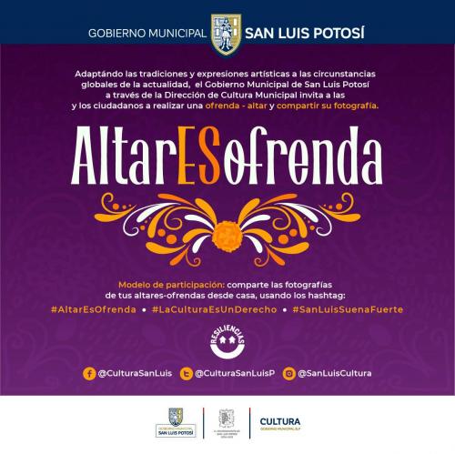 Para conocer la ofrenda colectiva #AltarEsOfrenda, se debe dirigir a las redes sociales de la Dirección: Cultura San Luis en Facebook, CulturaSanLuisP en Twitter y Sanluiscultura en Instagram.