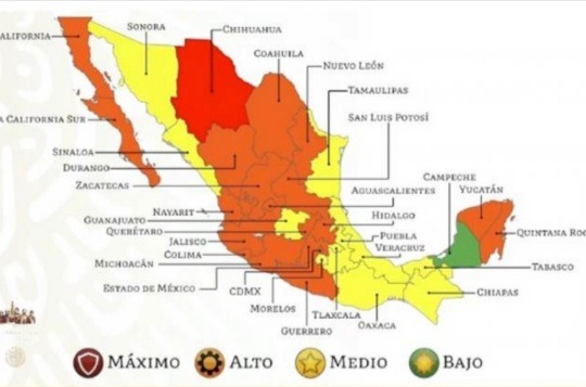 Mientras que los estados en semáforo amarillo, son Morelos, Veracruz, Sonora, Sinaloa, Tamaulipas, Guanajuato, Tlaxcala, Oaxaca, Puebla y Chiapas.