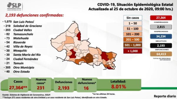 Ciudad Valles presenta al corte de este día un incremento de 17 contagios para un total de 3 mil 148 pacientes y 203 víctimas mortales; cabe recordar que durante los últimos ocho días, La Puerta Grande de la Huasteca había registrado una meseta de entre dos y seis casos diarios, por lo que el incremento al día de hoy 26 de octubre es de más del 100 por ciento.
