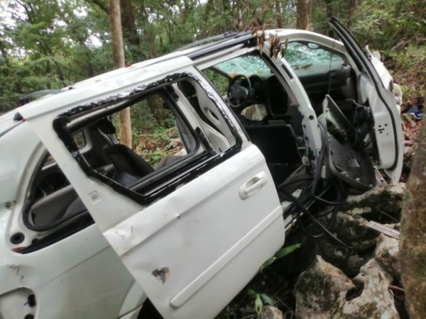 La mañana de este jueves se reportó al 911, que había una camioneta marca Dodge Caravan color blanco, al fondo de un barranco, en el kilómetro 53 de la carretera libre Valles-Rioverde.
