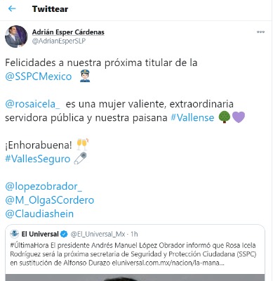 Luego de que se diera a conocer esta mañana por el presidente de la República, Andrés Manuel López Obrador, el nombramiento de la Huasteca Rosa Icela Rodríguez como nueva titular de la Secretaria de Seguridad de Protección Ciudadana, el alcalde de Ciudad Valles Adrián Esper Cárdenas, a través de sus redes sociales emitió sus felicitaciones a la funcionaria que se encargará de la seguridad de todos los mexicanos.