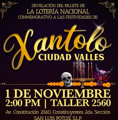 La develación de un billete de la Lotería Nacional alusivo a Ciudad Valles y Xantolo se llevará a cabo el domingo 1 de noviembre a las 2 de la tarde en San Luis Capital, en Avenida Constitución 2560, Constituyentes 2da sección.