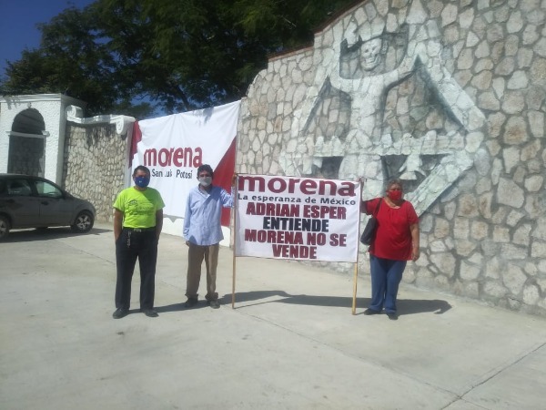 Rosa Lucía Cervantes, quien encabezó ayer la protesta en contra de Adrián Esper, permanecía en la puerta principal con una lona, en señal de protesta, que decía: Adrián Esper Entiende, Morena no se vende, MORENA la esperanza de México