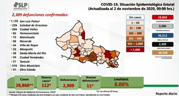 Sobre los nuevos 112 casos positivos a coronavirus, se detalló que se trata de 57 mujeres y 55 hombres, en un rango de edad de 4 a 97 años; mismos que tienen como residencia 71 en la capital; 15 en Soledad; tres de Matehuala; uno de Charcas; dos de Villa de Arista; uno en los municipios de Santa María del Río, Mexquitic y Salinas; siete en Rioverde; tres en Ciudad Fernández; uno en Ciudad Valles; tres en Tamazunchale; uno en Matlapa y San Martín; uno de otra entidad.